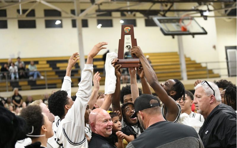 Saturday night’s 72-55 victory over the Tate Aggies put the exclamation on their third consecutive District 1-6A crown, the senior twins joining their teammates in a celebration the court, hoisting the trophy as the hometown fans cheered.