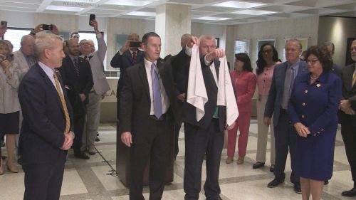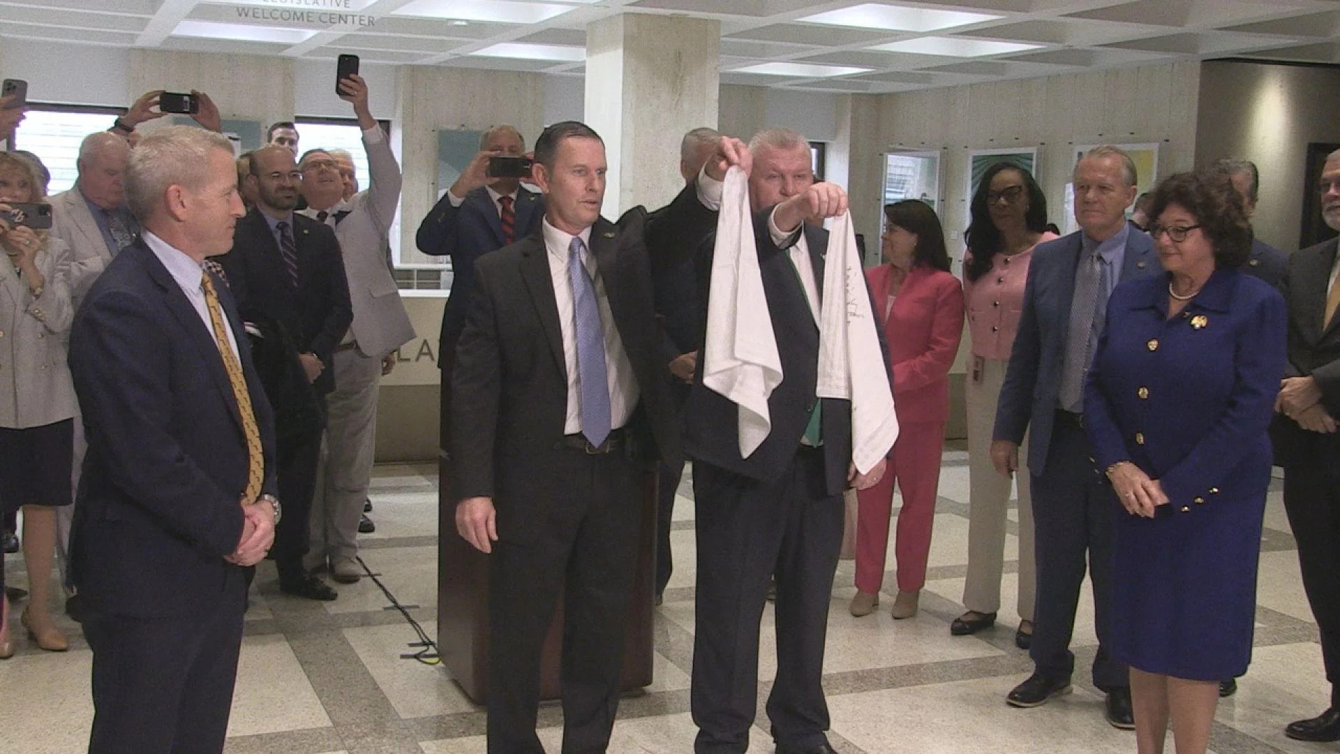 House Speaker Paul Renner (left) and Senate President Kathleen Passidomo watch a traditional hanky-drop ceremony to end the 2024 legislative session. Tom Urban