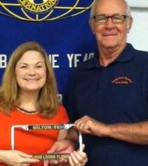 Pamela Holt, Santa Rosa Press Gazette editor and advocate for diabetes awareness was presented with the Milton Pride tag holder from Santa Rosa Sunrise Kiwanis President Jack Culberson, after her nar…