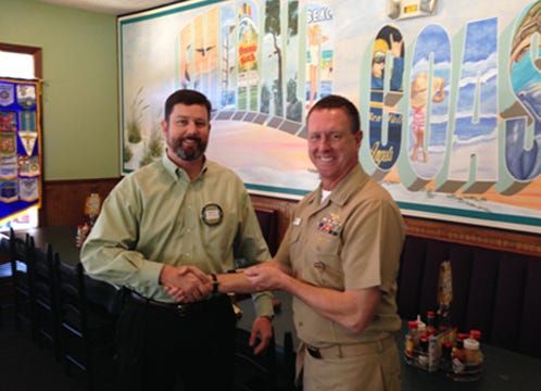Captain Matt Coughlin from NAS Whiting Field is pictured receiving the highly sought after Milton Rotary pen from President Rhett Fendley. Captain Coughlin updated the club on the mission of Whiting …