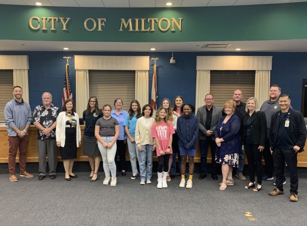 Representatives from the Tobacco Free Santa Rosa Coalition, including members of Students Working Against Tobacco (SWAT) clubs from several county schools, pose with Milton City Council members Tuesday, Jan. 3, after presenting the case for banning tobacco products from city parks.