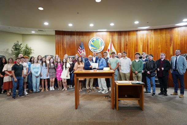 Maxwell brought some of his students from Central High School, who stayed throughout the meeting for a firsthand look at how local government operates. Commissioner Rhett Rowell, who is also a history teacher at Jay High School, read a proclamation to honor Maxwell.25 students and families housed