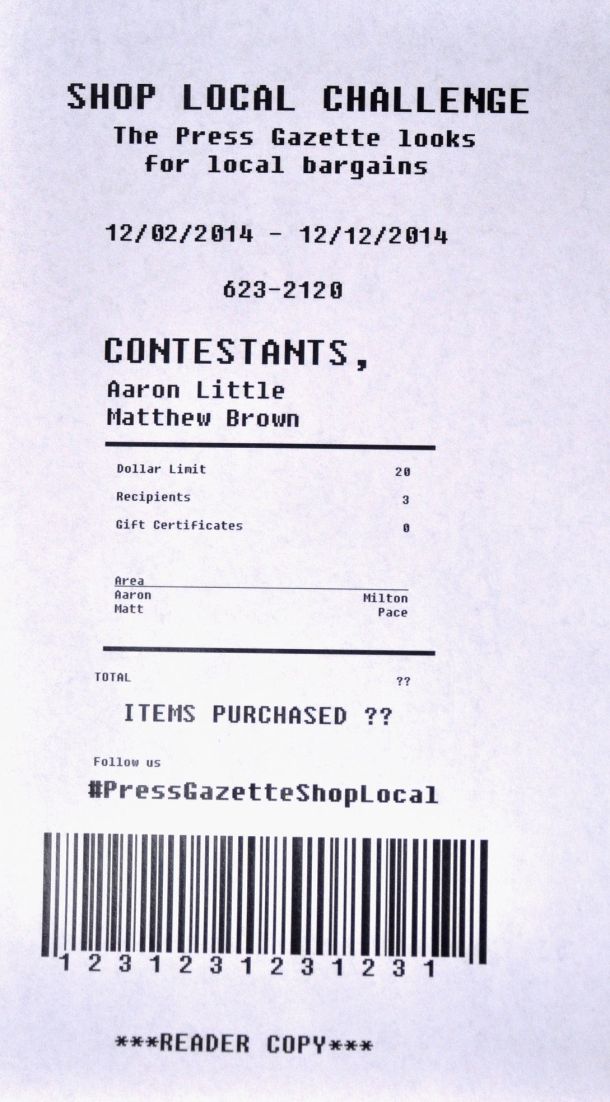Santa Rosa Press Gazette reporters Aaron Little and Matthew Brown have taken up a challenge this holiday season to see what bargains they can find shopping locally. The challenge is to see who can fi…