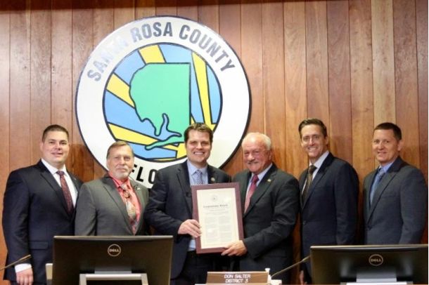 U.S. Congressman Matt Gaetz presented District 3 Commissioner Don Salter with a Congressional Record at the Feb. 23 board meeting, recognizing his service to the community.