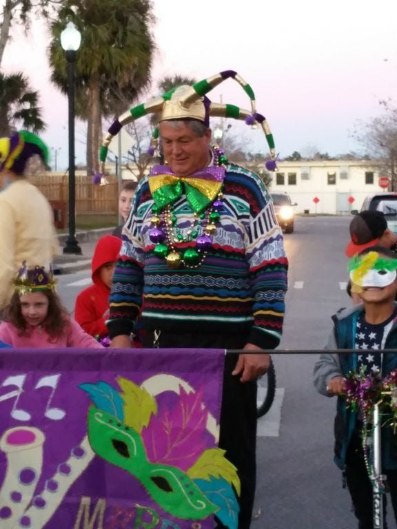 Rev. Matthew Dollahusen takes part in the children's Mardi Gras Parade along Oak Street the evening of Fat Tuesday February 9. Children and their parents looked on as they rode bikes, walked and part…
