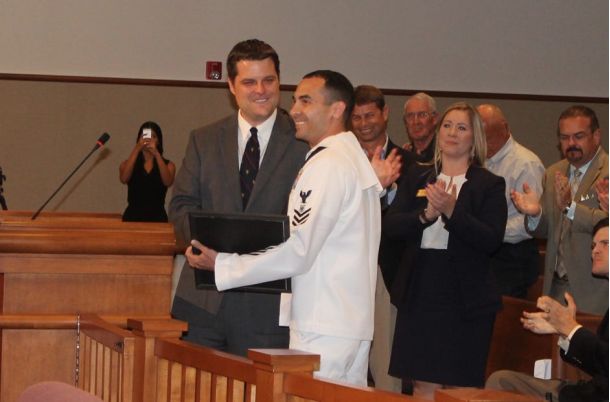 PENSACOLA — Congressman Matt Gaetz wants Petty Officer 1st Class Joseph Pellicano of Pace to receive credit for no small feat: helping to save a 17-month-old’s life.