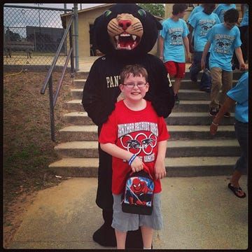 Dalton Thorpe, a Pea Ridge Elementary student poses with Victor E. at the Panther Patriot games and shared his photo with #socialsantarosa.