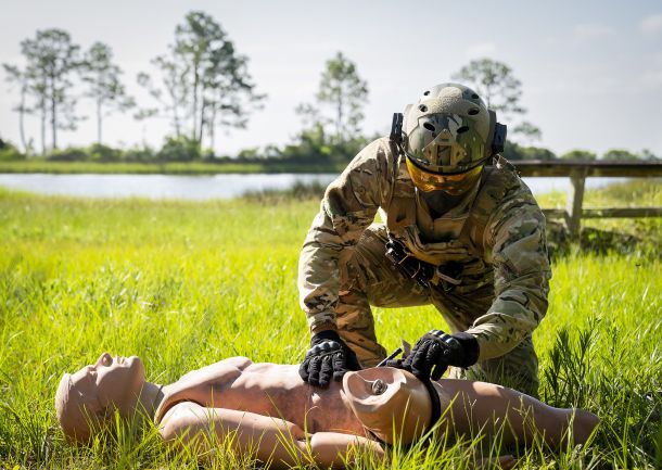Bright green paintballs whizzed through the humid air in all directions. Many zoomed past or contacted the advancing three-Airmen team desperately trying to reach a casualty 50 yards away.