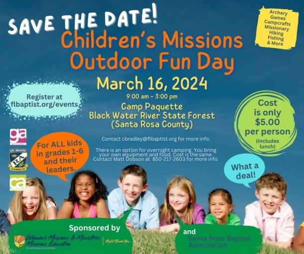 Area Royal Ambassadors, Girls in Action and Children in Action groups are invited to participate in a Children’s Missions Outdoor Fun Day from 9 a.m.-3 p.m. Saturday, March 16, at Camp Paquette in the Blackwater River State Forest. To register and for more information, go to flbaptist.org/events.