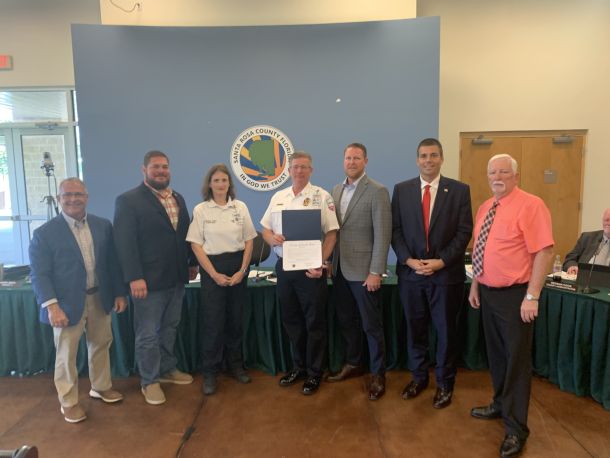 Jason Rogers, Chief of Lifeguard Emergency Medical Services of Santa Rosa County, holds a proclamation by Santa Rosa County Commission Chairman Colten Wright, third from right, declaring May 21-27 Emergency Medical Services Week. Also pictured are, from left, commissioners Kerry Smith and Sam Parker, Lifeguard EMS Operations Supervisor Deana Vess, and commissioners James Calkins and Ray Eddington.