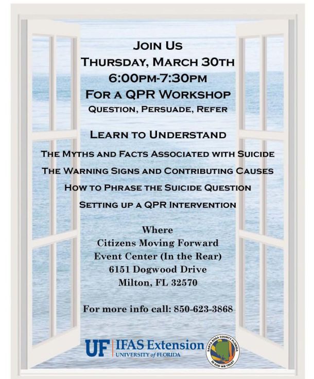 The University of Florida Institute of Food and Agricultural Services will host a QPR (Question, Persuade, Refer) Workshop from 6-7:30 p.m. Thursday at Citizens Moving Forward Event Center, 6151 Dogwood Drive in Milton, to help residents prevent suicide.