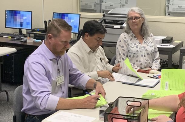 Santa Rosa County Commissioner Colten Wright, left, and County Judge Tony Giraud review “cured” ballots during the Canvassing Board’s meeting Thursday.