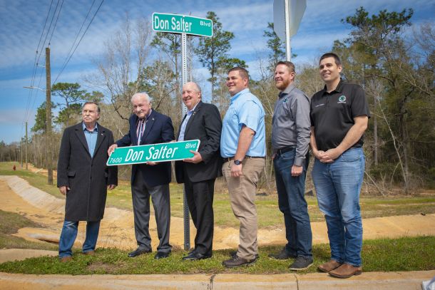 Santa Rosa County officials on Tues., Mar. 1, honored former County Commissioner Don Salter by naming a street that leads into the new Whiting Aviation Park after him. About 75 people were in attendance when the street sign labeled Don Salter Boulevard was unveiled by Salter and his family. Several people, including Salter, spoke at the event.