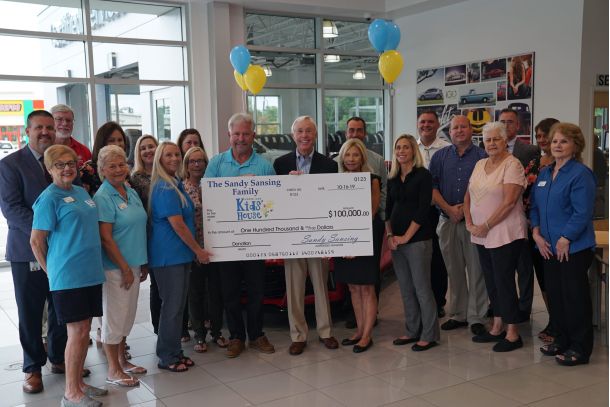 Sandy Sansing and his family presented Santa Rosa Kids House with a $100,000 donation Friday at his Chevrolet car dealership in Milton.