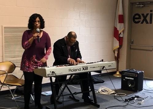 MILTON — Deacon Willie Smith leads attendees in singing How Great is Our God at the MLK Prayer Breakfast.