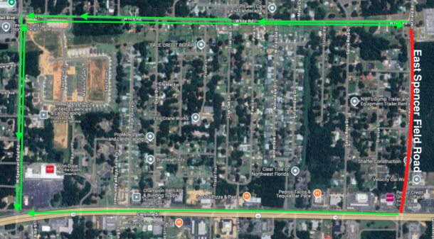 East Spencer Field Road will be closed at the Highway 90 intersection in Pea Ridge/Pace for repaving of the turn lane beginning at 6 p.m. on Thursday, May 1. Weather permitting, the road will reopen at 6 a.m. on Friday, May 2.