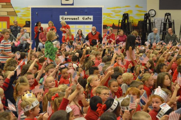 PACE — Dozens of parents, teachers and nearly 800 students dressed in red gathered at S.S. Dixon Primary School on Thursday morning to celebrate Veterans Day. The morning was cold and wet, but that …