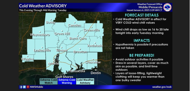 Santa Rosa County Public Safety urges residents to be prepared for the cold weather that will settle in late Monday (Jan. 6) through Tuesday (Jan.7) by remembering the 5 P’s of cold weather safety.