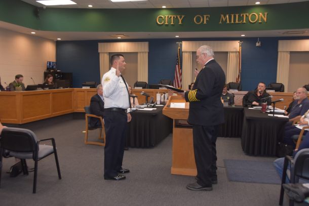 Fire Chief John Reble attended the Milton City Council meeting on Nov. 12 and announced their choice for the captain position as Steven Maddox. Reble officially promoted Maddox from lieutenant to captain with a swearing-in ceremony that was followed by Maddox’s pinning with the new insignia of his rank.
