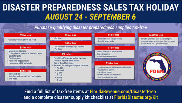 Florida Division of Emergency Management (FDEM) is encouraging Floridians to purchase disaster preparedness items during Florida’s second 14-day Disaster Preparedness Sales Tax Holiday of 2024 running Aug. 24 through Sept. 6. “The final disaster sales tax holiday for this year’s hurricane season could not come at a better time as we enter the historical peak […]