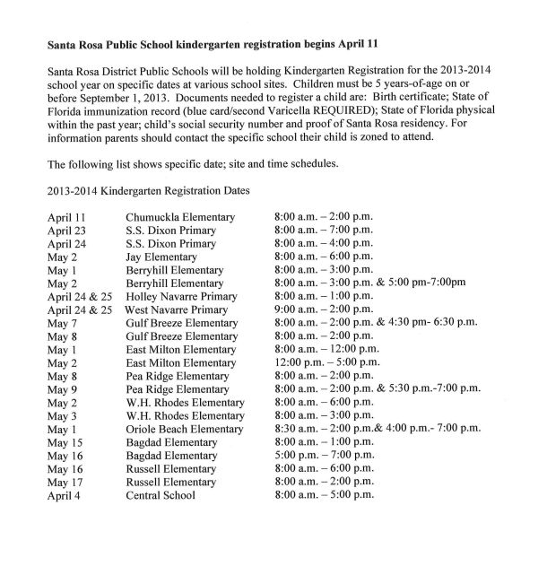 Santa Rosa District Public Schools will be holding Kindergarten Registration for the 2013-2014 school year on specific dates…