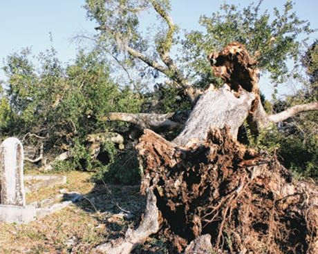 Graves at the Milton Cemetery on Berryhill Road were spared Friday night when a rainstorm with high winds took down a large old oak tree. The tree uprooted and broke at the top of the trunk then tumb…