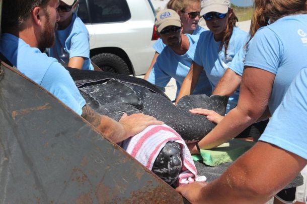A leatherback turtle measuring more than 6 foot from head to tail was brought to the Gulfarium Marine Adventure Park Friday after stranding itself in Pensacola Beach Friday morning.
