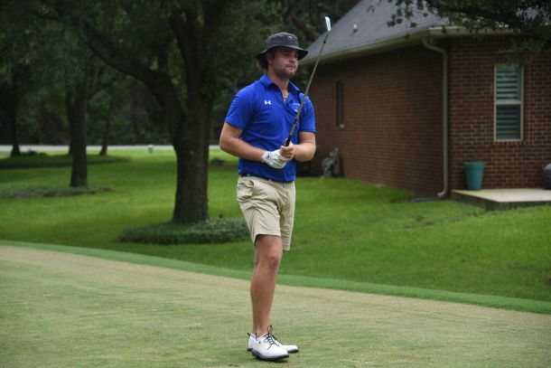 He points over to the putting green where the senior standout is getting in a little extra work before practice starts.