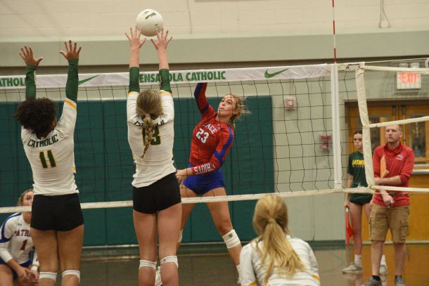 Ashlyn Hines chased after the ball late in the third set of a tightly contested volleyball match against Pensacola Catholic last Monday night. She was able to bump it behind her as she ran towards the sideline, setting up an opportunity for Cambree Klein to throw down a kill and tie the score at 24-24.