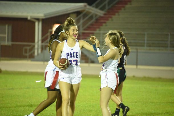 Ava Wheaton steps in front of a pass and snags the ball, setting up what turns out to be an interception return for a touchdown as Pace begins to pour on the points against Navarre in a game last Wednesday night at Bennett C. Russell Stadium.
