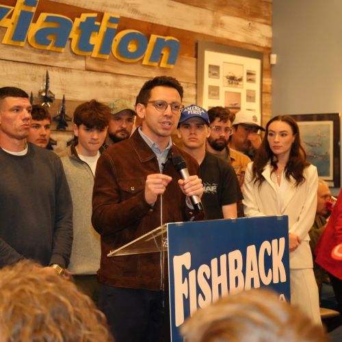 Republican Florida gubernatorial candidate James Fishback drew a large crowd of younger voters during a campaign stop Feb. 23 at Ace’s Hanger Southern Grill and Bar in Milton, where supporters cited concerns ranging from overdevelopment and affordability to religious values and generational political change.
