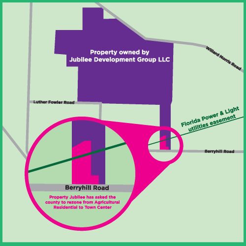 Jubilee developers are asking to rezone 34 acres on Berryhill Road from AG-RR (rural residential) to TC-1 (town center core) while stressing that the project is not part of its vision for a 2,700-acre planned community northeast of Pace.