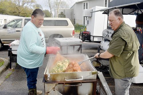 ‘Moore & Les’ – Mike Moore, left, and Les Evirette – check on boiling bags of potatoes and other vegetables.