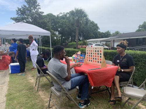 Erica McGill, event coordinator for the Fellowship of Churches Santa Rosa County Sow & Reap mentorship program plays Connect-4 with Marques Williams, a Milton High School senior and tutor in the program.