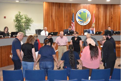Pro-life and anti-pornography activists gather to pray during a break in the Santa Rosa County Commission meeting Thursday in Milton.