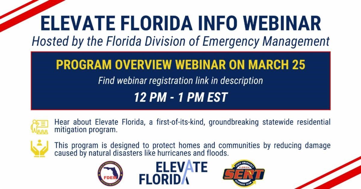 For more information and links to register for one of the two webinars, visit www.floridadisaster.org/dem/mitigation/elevate-Florida/.
