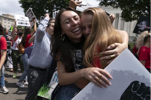 Anti-abortion protesters celebrates after the news of Supreme Court overturned Roe v. Wade outside the Supreme Court in Washington, Friday, June 24, 2022. The Supreme Court has ended constitutional protections for abortion that had been in place nearly 50 years, a decision by its conservative majority to overturn the court’s landmark abortion cases. (AP Photo/Jose Luis Magana)
