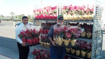 Michael Vazquez (left), financial advisor with Edward Jones, and Roger Malone, Kiwanis past president, unloaded poinsettias for Kiwanis’ annual holiday fundraiser, Thursday. Penny Wilson, with Kiwani…