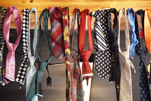 A few of the ties hanging from the ceiling at the Beardless Brewhouse, signed and dated by newly-minted pilots.