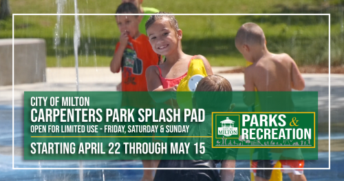 Due to popular demand, the Milton Splash Pad at Carpenter’s Park is open for limited days and hours.