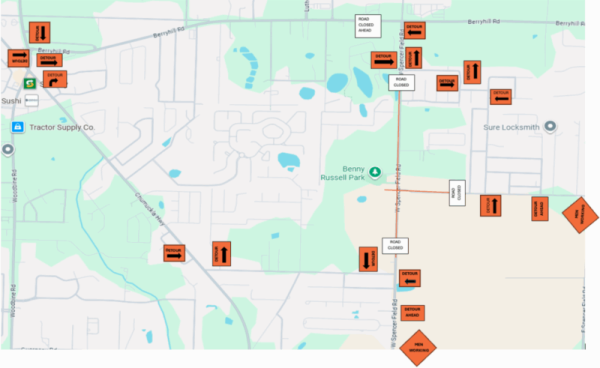 Driveway access will be allowed for properties within the closed portion. Drivers north of the closure may use West Spencer Field Road to Berryhill Road to Chumuckla Highway to Adams Road as a detour. Those south of the detour may use the reverse. Drivers are asked to use caution and expect delays in the area.