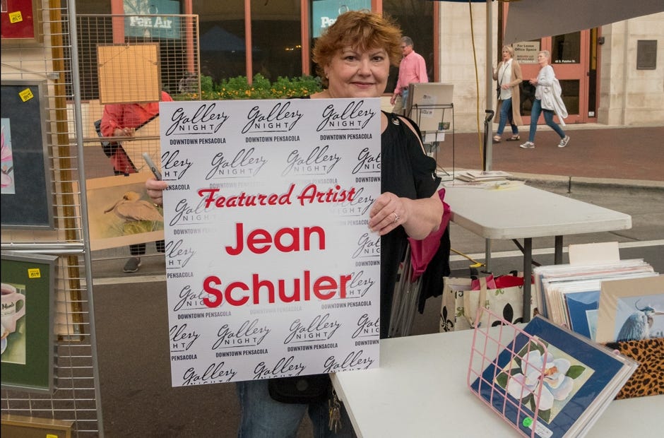 PENSACOLA — Under a tent on Palafox Street, Milton’s Jean Schuler, a watercolor artist, was Pensacola Gallery Night’s featured artist.