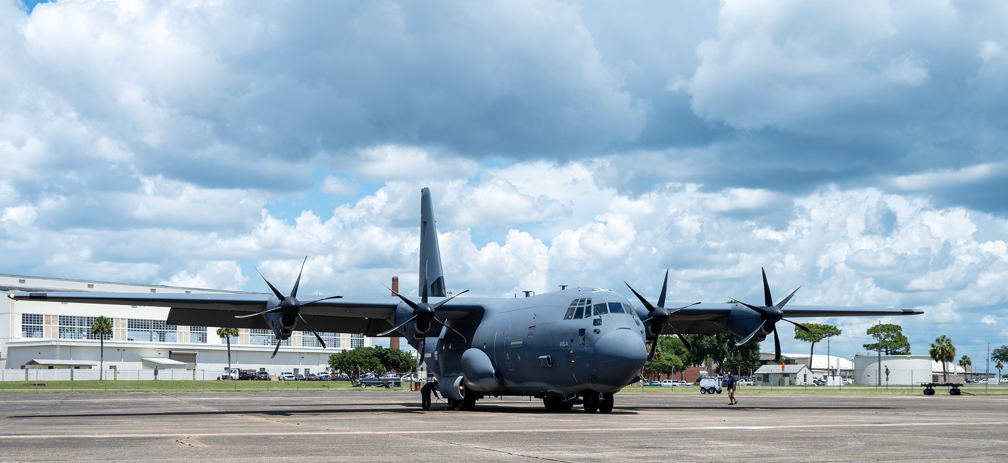 The whirling blades of the four Rolls-Royce turbo-prop engines drowned out all other sounds on Eglin’s flightline as the 96th Test Wing’s newest aircraft rolled to a stop at its new home July 17.