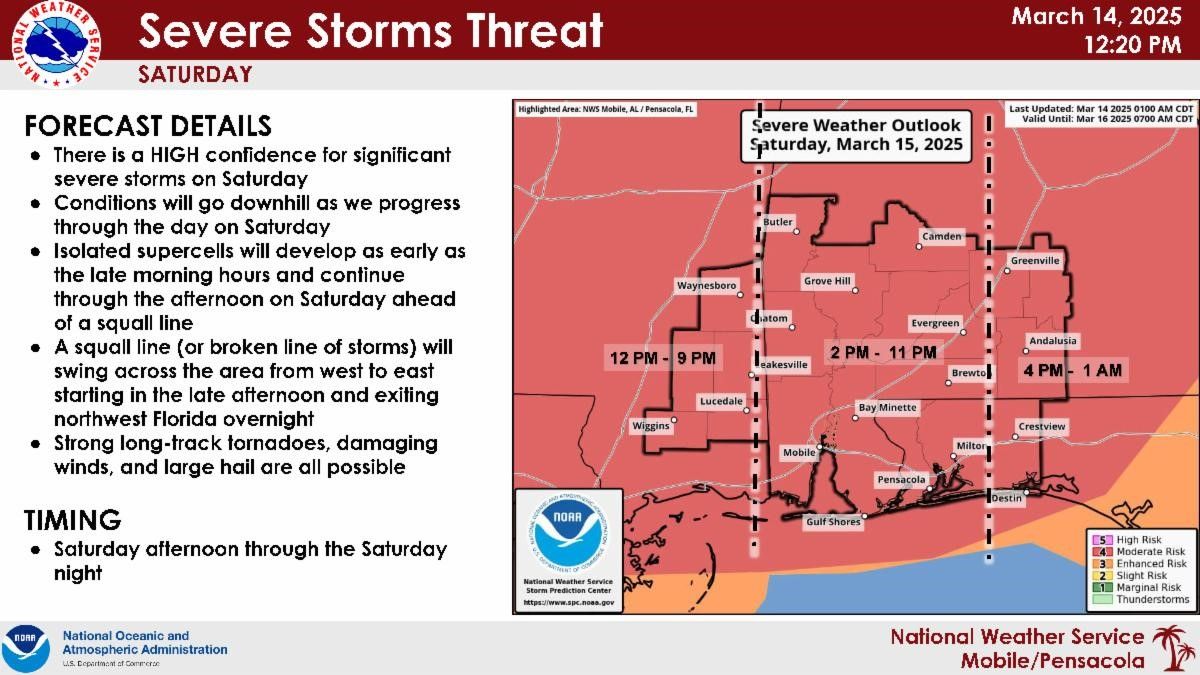 The National Weather Service in Mobile is predicting isolated severe weather conditions for our area tonight, Friday, March 14. Santa Rosa County has been placed under a MODERATE risk of severe weather through Saturday, March 15.