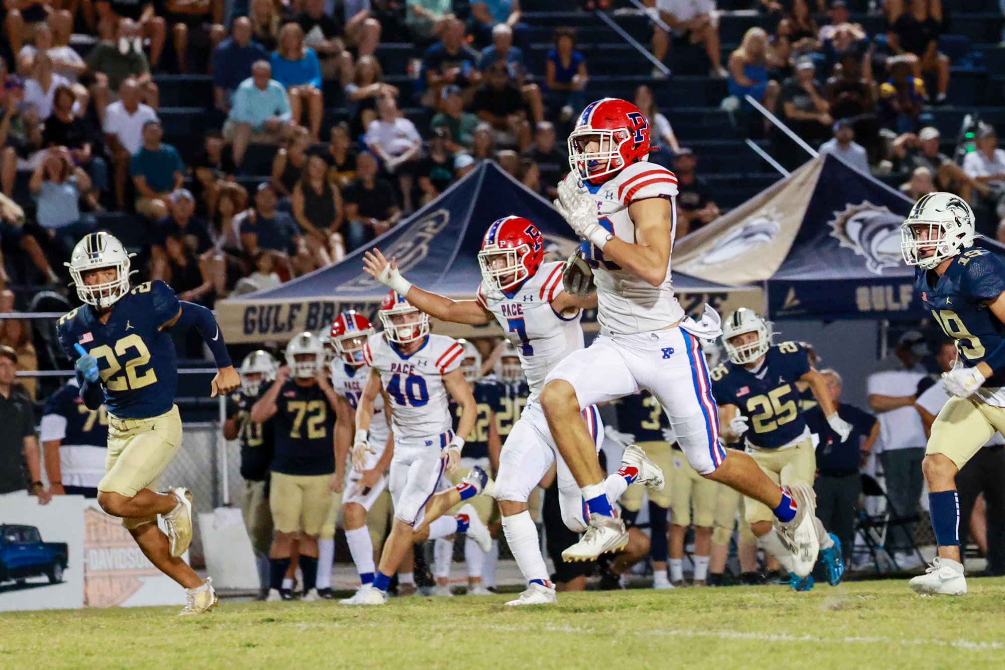 The Pace Patriots opened District 1-4S play last week with a 55-24 win over the Gulf Breeze Dolphins, breaking a six-year losing streak to the Dolphins to move to 4-1 for the season.