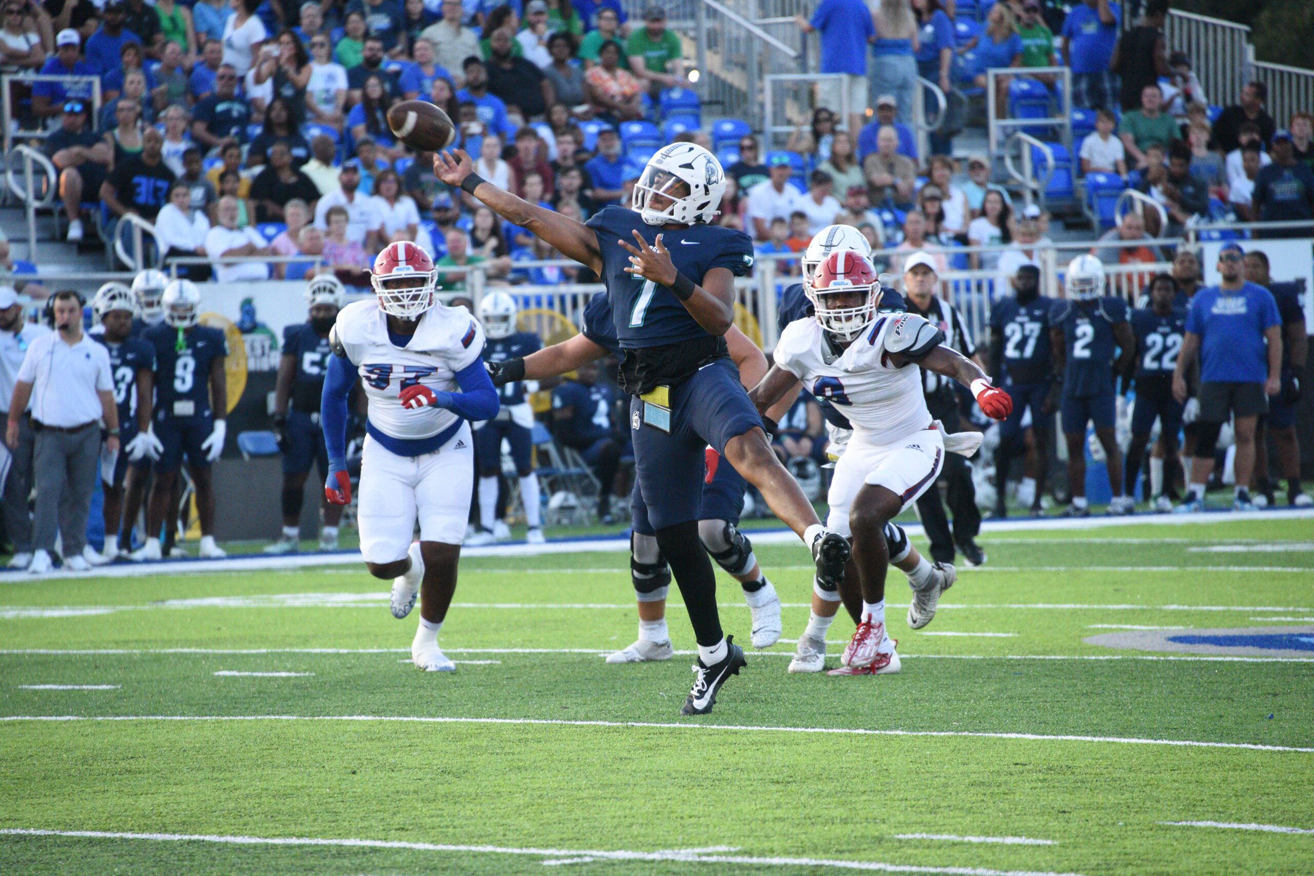 Peewee Jarrett unleashed a long throw down the field, the ball destined to find the hands of John Jiles, who leaped in the end zone in an effort to make the grab.