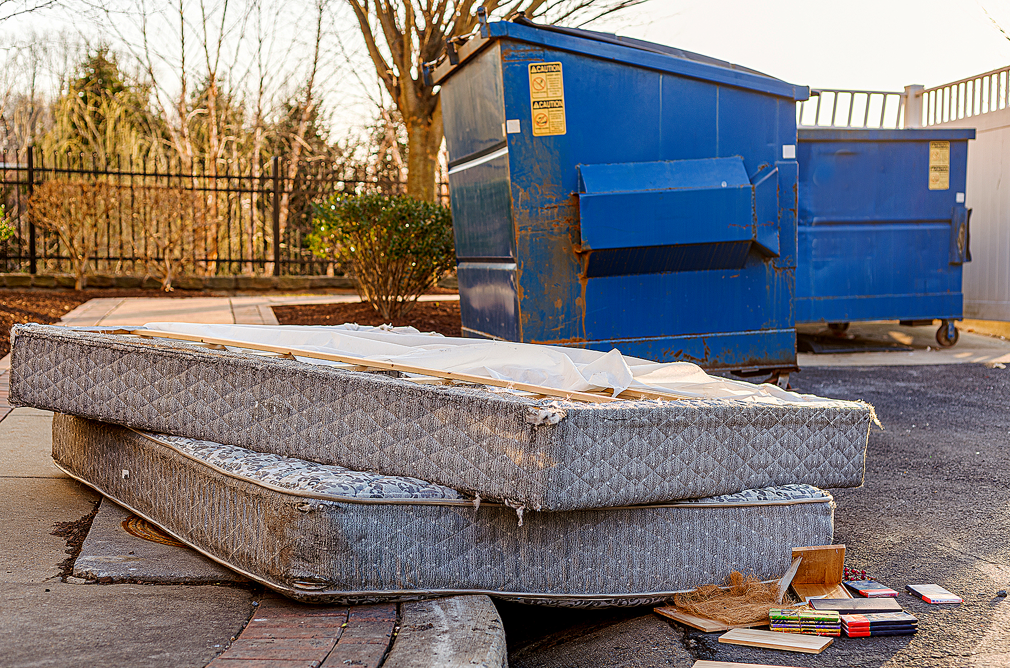 Despite HOA regulations by the Home owners association, residents still illegally dump bulk items by the residential trash containers. Two old mattresses left behind by dumpster create unsightly look.