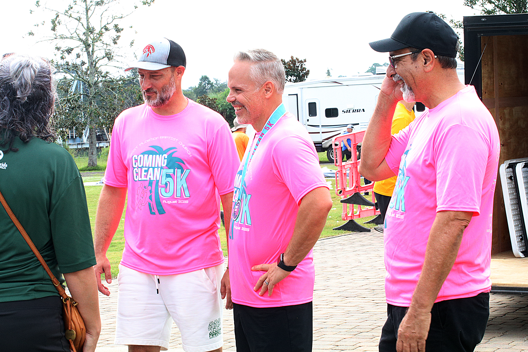 All smiles at West Florida Baptist Church’s Fifth Annual Coming Clean 5K. Senior Pastor Mike Brown (center) is flanked by Missions Pastor Dan Libby (left) and Coming Clean Recovery Director Mark Yorey (right) at the Milton Riverwalk.